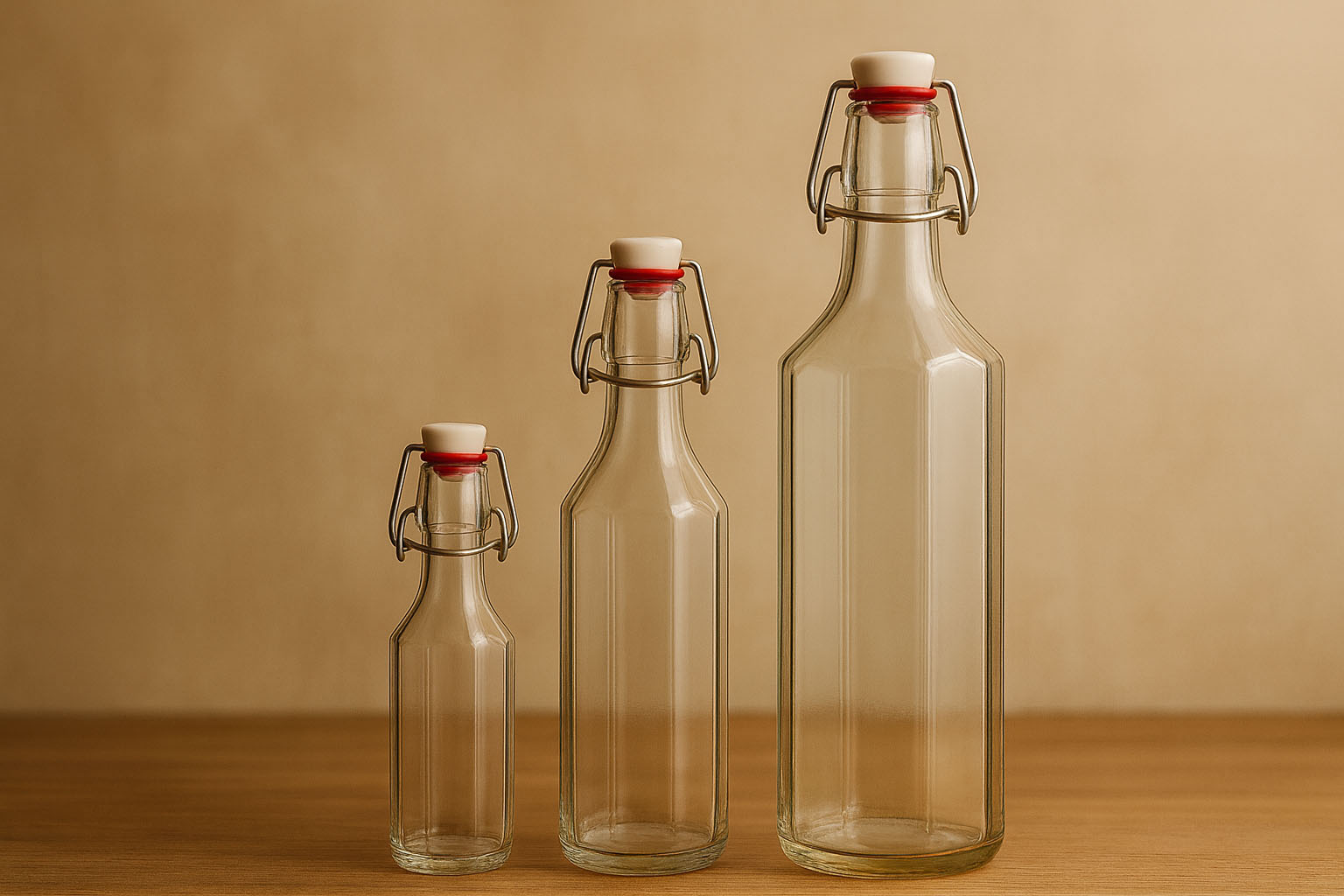 Serien „Bravo“ övertygar med sin markanta, tiohörniga form som förenar elegans och funktionalitet. Tillverkad av högkvalitativt klart glas, framhäver denna ovanliga flaska innehållet på ett stilfullt sätt. Finns i volymstorlekar från 250 till 1000 ml och erbjuder „Bravo“ den perfekta lösningen för olika drycker. Tack vare den praktiska bygelkorken, för vilken passande korkar finns i vårt sortiment, kombinerar den ett traditionellt stängningssystem med modern estetik.