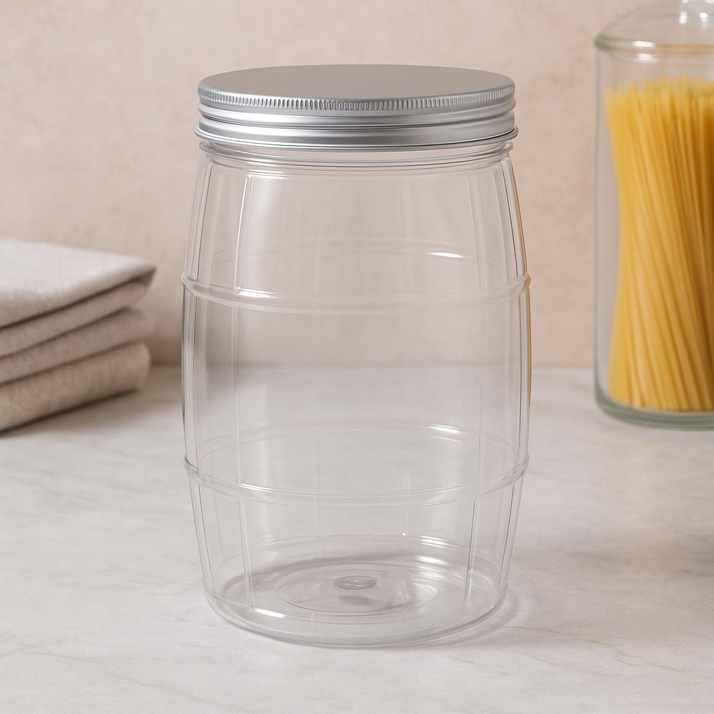 PET-burken "Fat" kombinerar en unik design med praktisk funktionalitet och erbjuder en detaljerad återgivning av ett klassiskt träfat. Med en volym på 1,5 liter är den idealisk för förvaring av olika produkter, från livsmedel till dekorativa föremål. Den generösa öppningen 100/400 möjliggör enkel påfyllning och säker förslutning – passande lock finns i vårt sortiment. Tack vare det lätta, okrossbara PET-materialet är burken inte bara ett visuellt blickfång utan också särskilt hållbar och mångsidig att använda.
