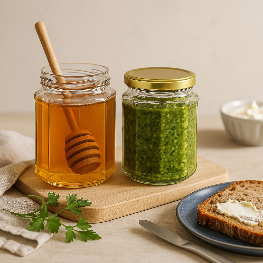 De eleganta flerkanterna glasen kombinerar estetisk design med praktisk funktionalitet. Deras tolvkantiga bas ger dem ett särskilt utseende och möjliggör samtidigt platsbesparande förvaring. Tillverkade i Europa imponerar de med sin högkvalitativa bearbetning och mångsidighet. Oavsett om det gäller aromatiska pastor, kryddiga pestos, fruktiga marmelader eller fin honung – dessa glas erbjuder den perfekta förpackningen för olika specialiteter.