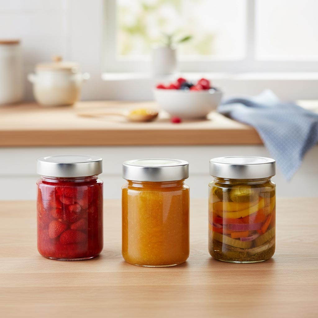 Produktserien „Rundglas Deep Twist Off“ från Flaschenland omfattar högkvalitativa glasbehållare som är speciellt utvecklade för mångsidig förvaring och konservering. Huvuddraget i denna serie är den innovativa Deep-Twist-Off-öppningen (DTO 58), som säkerställer en säker och enkel hantering. De 253 ml stora rundglasen „Summertime“ utmärker sig genom sin robusta och hållbara materialkvalitet. De är köldbeständiga, värmetåliga, mikrovågssäkra samt ugnssäkra och därmed mycket mångsidiga i användning. Dessutom är de diskmaskinsvänliga, vilket garanterar enkel rengöring. Det klara glaset möjliggör en attraktiv presentation av innehållet, medan den runda formen ger optimal förvaringsutrymme.