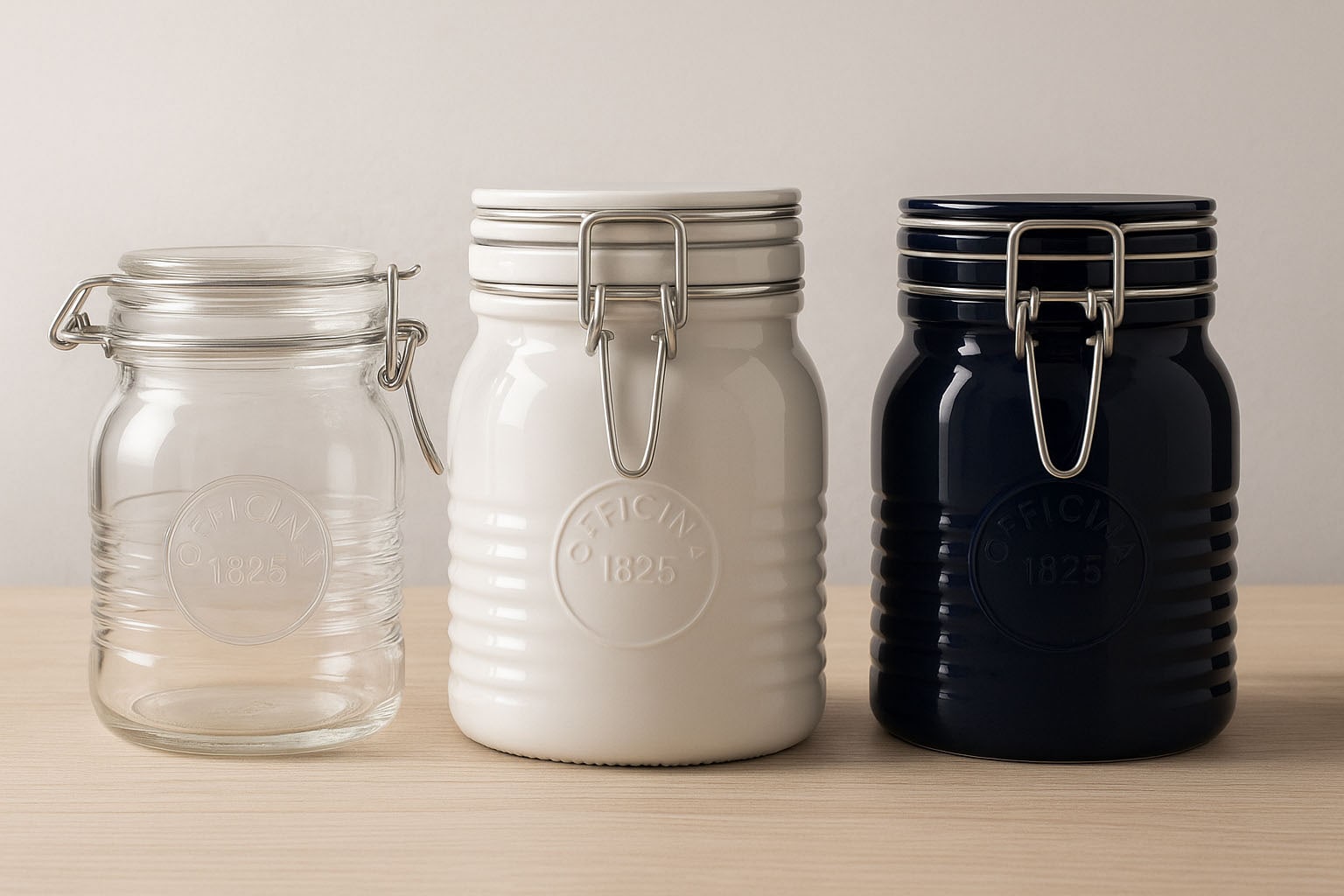 Serien „Officina 1825“ från den italienska tillverkaren Bormioli Rocco kombinerar högkvalitativt hantverk med nostalgisk charm. Den karakteristiska designen med räfflor i glasets kant och den ingraverade „1825“-logotypen gör varje glas till en verklig blickfångare. Dessa stilfulla trådklämglas har utvecklats speciellt för delikatessproducenter, hotell och kräsna privatfyllare som värdesätter estetik och kvalitet. Finns i färgerna blå, röd och vit som en del av specialserien Color, erbjuder „Officina 1825“ en exklusiv möjlighet att förvara fina specialiteter smakfullt och säkert.