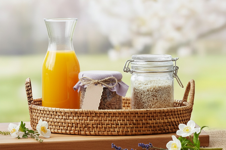 Ett tips är temat ”Frukost i det gröna”: Presentera sylt, honung eller juice i dekorativa burkar och flaskor – till exempel klassiska honungsburkar, små runda burkar eller stilrena juiceflaskor. Komplettera med provsmakningsskedar och små burkar så att kunderna kan testa olika sorter direkt. Det skapar förtroende för kvaliteten och uppmuntrar till spontana köp.