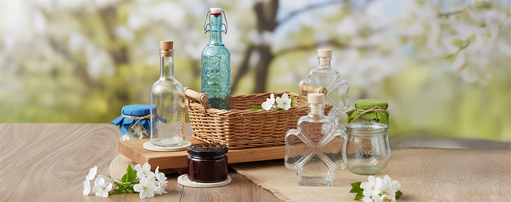 Börja med stora WECK-burkar eller klassiska flaskor som passar utmärkt som vaser för blommande kvistar och vårblommor. Det blir extra tilltalande om du kombinerar olika storlekar och former. Arrangera dekorativa syltburkar eller bygelkapsylflaskor med dina produkter i små grupper på trälådor eller brickor. En triangulär uppställning skapar dynamik och drar blickarna till dina vårerbjudanden.
