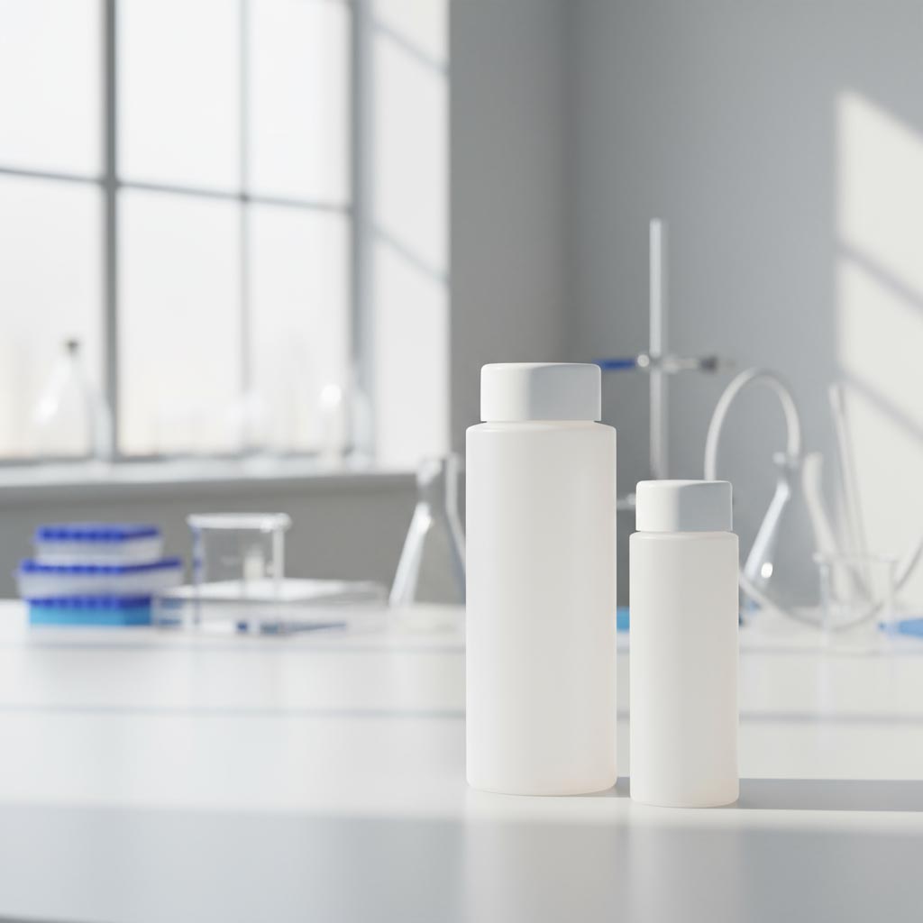 Glasoflaskor Skruvlock rund flaska med sprutinsats, PE-plast, vit, för mynning: GL 22